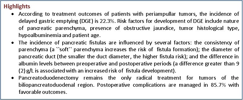 Conclusion: At present, pancreatoduodenectomy remains the only radical treatment for tumors of the biliopancreatoduodenal region. Postoperative complications were observed in 28.8% of patients. In 85.72% of cases, complications were managed conservatively with favorable outcomes.
