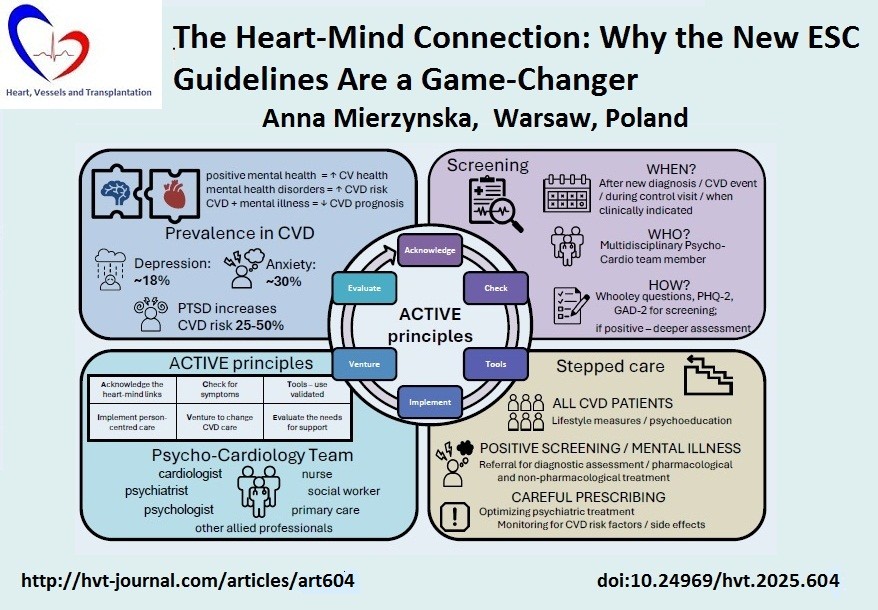 During the European Society of Cardiology (ESC) Congress of this year, new guidelines were announced in several clinically relevant areas, including the consensus statement on mental health and cardiovascular disease (CVD) (1). Issues related to mental health, psychosocial factors, and access to psychological support have been present in the guidelines and other ESC documents for some time, showing how awareness of the importance of these topics for cardiac health is increasing (2, 3). This new document responds to the growing need to structure current knowledge and propose consistent methods of diagnosis, treatment, and care of mental health disorders in the context of CVD. The consensus statement addresses key issues related to the relationship between mental health and cardiovascular health, proposing methods and protocols for screening, diagnosis, and pharmacological and non-pharmacological interventions, with an emphasis on multidisciplinary care. An important aspect of this document is that patients from the ESC Patient Forum participated in its creation, and it includes clinical cases and patient perspectives, which is an important additional element that puts into practice certain principles and values shaping the document.