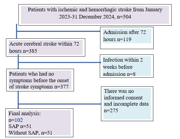 Among 504 patients admitted with acute cerebral stroke to the department during study period, 102 were eligible to be included in the study (Fig. 1) All the subjects were divided into 2 groups: the main group consisted of 51 patients with SAP and the control group consisted of 51 patients without SAP.