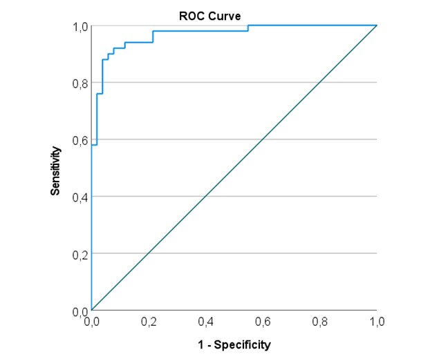 Figure 3 shows the ROC analysis curve constructed using the predictive model of multiple logistic analysis. It can be seen that the model shows a very good discrimination ability (AUC= 0.967, 95CI 0.936 to 0.998). The Youden index for the model was 0.842, with the cutoff of the probability (P) equaled to 0.472. Having this level of probability, the model showed a sensitivity of 92.0 and a specificity of 92.2 for SAP prediction.
