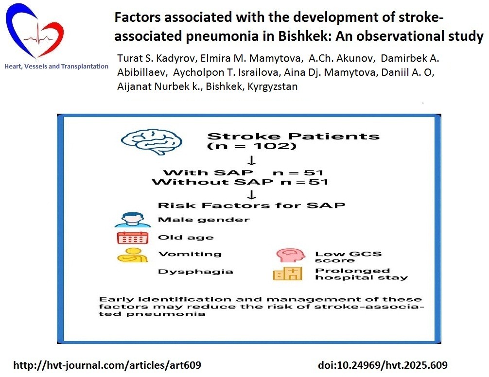 Methods: The study design is a single–center, prospective, observational, cohort study on predictors of SAP in stroke patients and their diagnostic value. The study included 108 patients with stroke who received in-patient treatment from the Stroke Department in Bishkek City Clinical Multiprofile Hospital No. 2 and were divided into 2 groups: the main group consisted of 51 patients with SAP and the control group consisted of 57 patients without SAP. Demographic, clinical, neurological status, laboratory tests and neuroimaging parameters were analyzed to compose a predictive model with the determination of independent factors of SAP development.