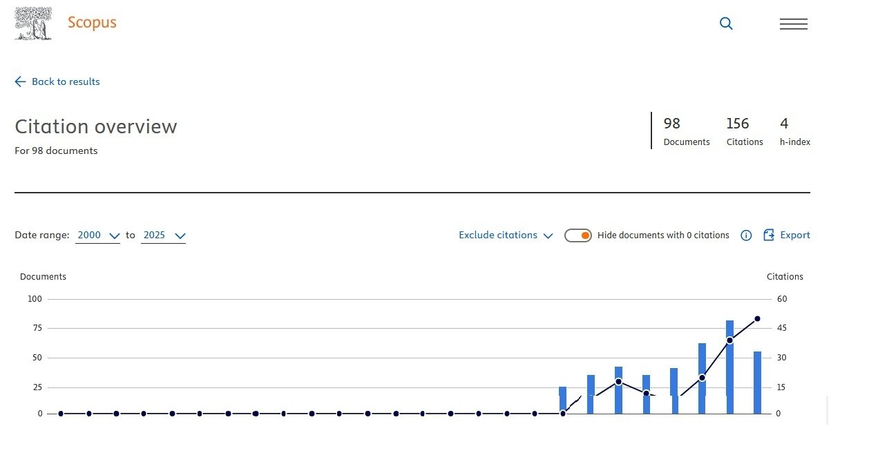 We also happy to share that number of citations in SCOPUS database increased (156) and 1/4th of our articles received citations, our Hirsch index is 4 (Fig. 1). As you can see, our CiteScore for 2025 is 0.3 as compared to 0.2 in 2024. This is a good news, despite increase of articles published, our number of citations increased as well. We aim to improve further our indicators, increase of quality of content and it presentation.