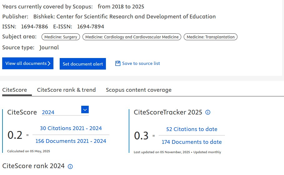 Figure 1. SCOPUS Hirsch index, number of citations and cited documents (left ) and SCOPUS CiteScore (right) panel by December 2025 for Heart, Vessels and Transplantation (1)