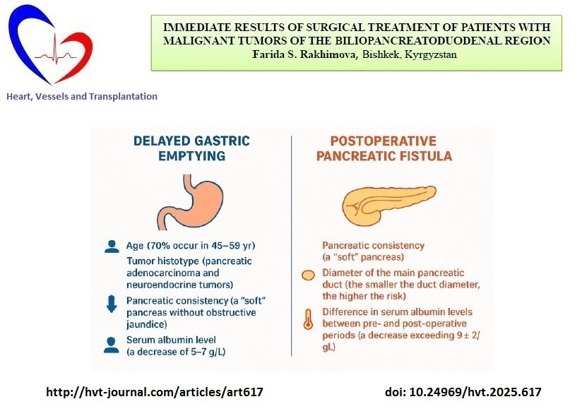 The aim of the present study was to evaluate To evaluate the outcomes of surgical treatment of patients with malignant tumors of the biliopancreatoduodenal region (BPDR) in the Kyrgyz Republic and to determine the relationship between the development of postoperative complications and factors such as the duration of surgery, the use of external biliary drainage, and the characteristics of the pancreatic parenchyma.