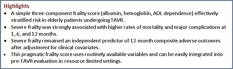 In this cohort of elderly patients undergoing TAVR, frailty assessed using a simple three-component score—incorporating serum albumin, hemoglobin, and ADL dependence—was a strong independent predictor of adverse outcomes at 1, 6, and 12 months. Patients with severe frailty consistently experienced the highest risk profiles. Because this score relies entirely on parameters readily available in routine clinical practice, it offers a practical and easily implementable approach for risk stratification. Integrating this assessment into preprocedural evaluation may enhance clinical decision-making, optimize perioperative management, and support shared discussions between clinicians, patients, and families. Further prospective studies are needed to validate this approach in larger and more diverse populations and to determine whether targeted interventions addressing frailty can improve post-TAVR outcomes. Given the retrospective single-center design and modest sample size, these findings should be considered hypothesis-generating and warrant confirmation in larger multicenter cohorts.
