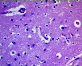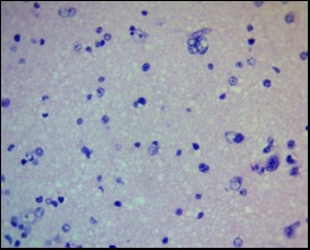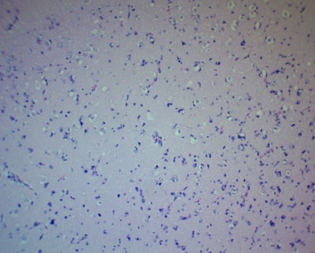 Neuroglial rarefaction and loss of cellular density (decrease in the number of cells per a certain area), especially astrocytes and oligodendrocytes, were noted in limited areas, which could reflect both vasogenic and cytotoxic nature of the edema (Fig. 2).