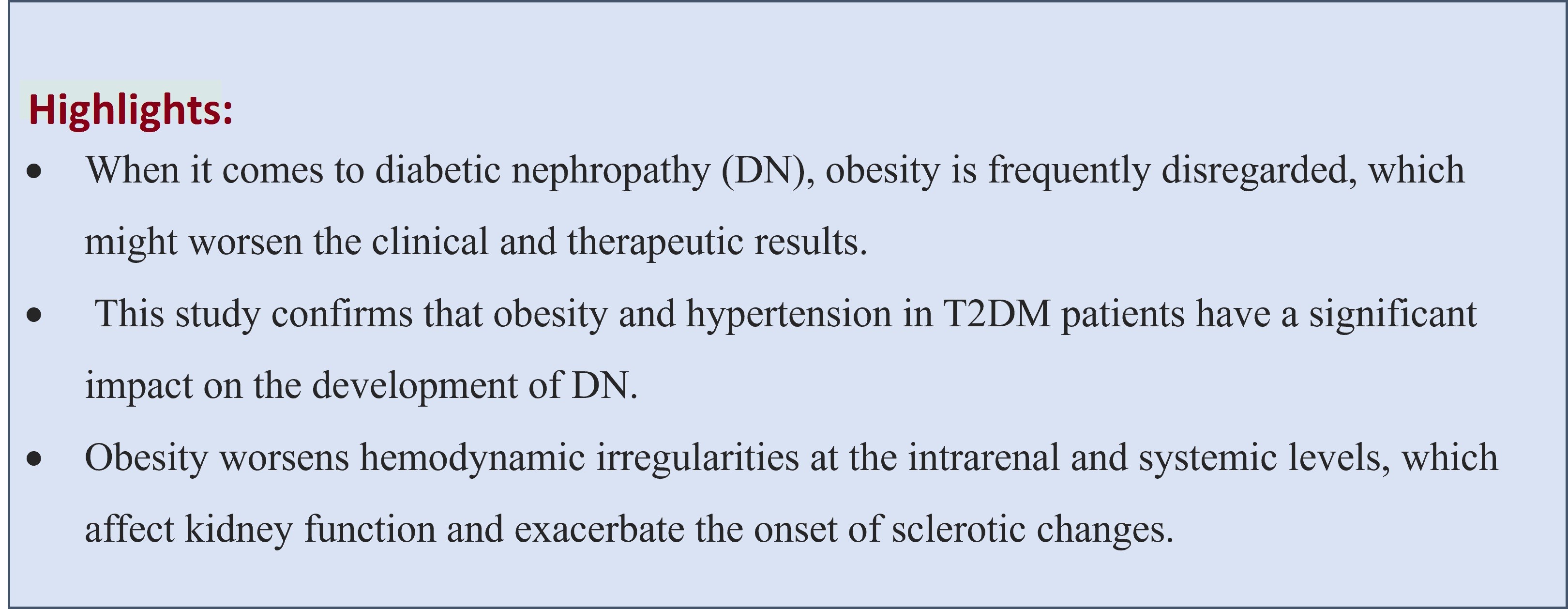Obesity is a recognized contributor to T2DM and has been increasingly implicated in DN; however, the extent to which obesity independently influences the onset and progression of diabetic nephropathy remains to be fully elucidated. Some studies indicate that metabolic syndrome, including obesity, may be associated with the development of DN.
