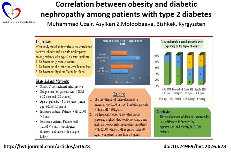 Methods: This cross-sectional retrospective study included 60 patients with T2DM (32 men and 28 women) aged 44 to 86 years (mean age 62.0 (10.0) years). Those patients included who have had T2DM for more than five years. Anthropometric parameters measured included body mass index (BMI), blood pressure (BP), and blood tests for glucose, glycosylated hemoglobin (HbA1C), total cholesterol, triglycerides, high-density lipoprotein (HDL), and low-density lipoprotein (LDL). The severity of diabetic nephropathy was assessed by the level of microalbuminuria in urine excretion. The patients were categorized into two groups: those with obesity (BMI ≥ 30 kg/m2) and those without (BMI < 30 kg/m2).