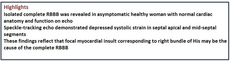 Case presentation: An apparently healthy lady was found to have a CRBBB on an incidental ECG. Routine echocardiography showed normal cardiac anatomy and function. Speckle-tracking echocardiography depicted preserved global strain of the left ventricle with depressed peak systolic strain of septal apical and mid-septal segments. We present a focal myocardial insult in the area corresponding to the anatomy the right bundle of His. Such correlation may explain the CRBBB present in the otherwise healthy patient.