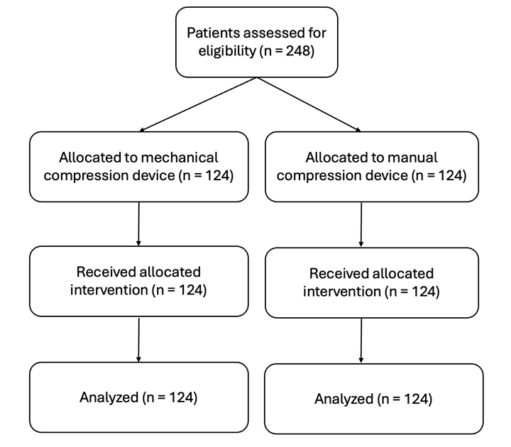 A total of 248 patients were included in the final analysis, of whom 124 were assigned to the mechanical group and 124 to the manual group, ensuring balanced allocation and comparability between the two treatment arms (Fig. 3).