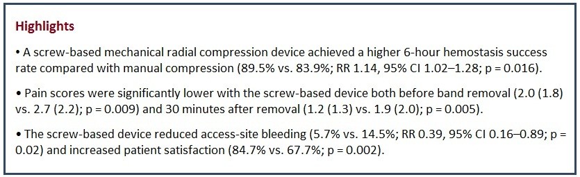 Conclusions: Compared with manual compression, a screw-based device provides superior hemostatic efficacy and reduces access-site complications while significantly improving patient experience, with lower pain during compression and after band removal.