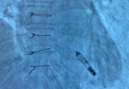 Figure 6. Fluoroscopic image showing the Aveir™ VR leadless pacemaker positioned in the right ventricular septum
