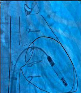 Implantation (Fig.4-9) was performed via the right femoral vein under fluoroscopic guidance using the Aveir™ VR leadless pacemaker system (Abbott, USA). After ultrasound-guided venous access, a 0.035สบ guidewire was advanced to the superior vena cava, and a 25F/27F introducer sheath was inserted.