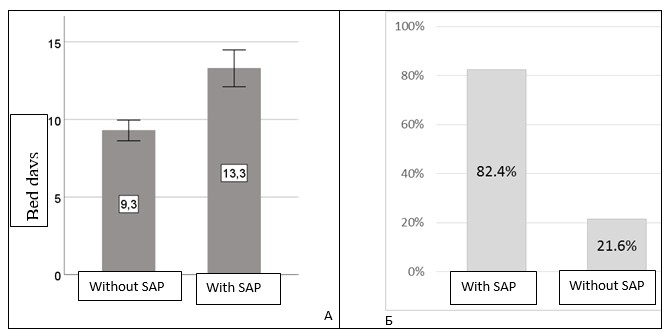 All indicators of vital functions differed statistically when comparing the groups. Thus, systolic blood pressure in the SAP group was higher than in patients in the group without SAP (p =0.028) and exceeded normal values, while diastolic blood pressure, heart rate, respiratory rate, although were higher in the SAP group (all p<0.05), remained at the upper limit of the normal values. It is noteworthy that the oxygen saturation in the SAP group was closer to critical values (p<0.001), and the temperature was elevated, although it remained within subfebrile values (p<0.001) as compared to group without SAP.