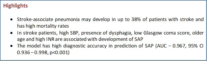Results: According to the results of multiple logistic regression analysis, it was revealed that the levels of systolic blood pressure, the presence of dysphagia, low Glasgow scale scores, age, as well as the level of INR at admission were independent factors associated with the development of SAP. The model showed a very good discrimination ability (AUC= 0.967, 95%CI 0.936-0.998p<0.001).
