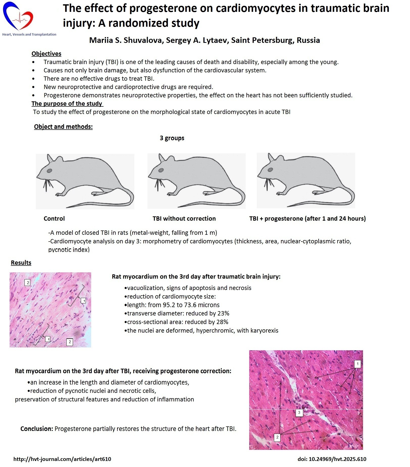 Objective: Traumatic brain injury (TBI) is one of the leading causes of death and disability in the world, especially among young people of working age. In addition to direct brain damage, TBI causes repercussive organ changes, including dysfunction of the cardiovascular system, which worsens the prognosis of patients. Currently, there are no effective medicines for the treatment of TBI, and the search for new neuroprotective and cardioprotective drugs remains an urgent task. Progesterone, widely used in gynecology, has demonstrated neuroprotective properties in experimental models of TBI, but its effect on the heart during trauma has not been sufficiently studied.