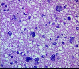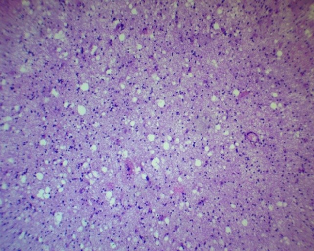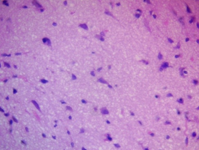 Neuroglial rarefaction and loss of cellular density (decrease in the number of cells per a certain area), especially astrocytes and oligodendrocytes, were noted in limited areas, which could reflect both vasogenic and cytotoxic nature of the edema (Fig. 2).