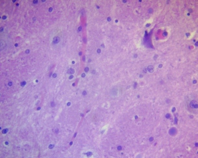 Figure 12. Glioblastoma PFZ. Marked microgliosis. H&E, ×400.
