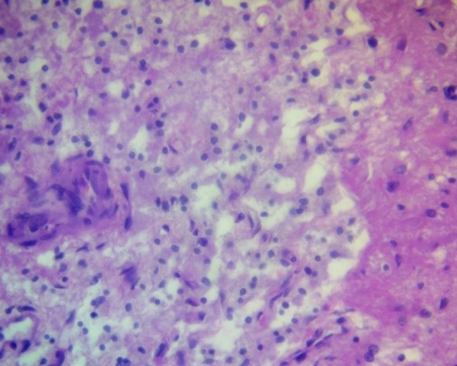 Porous or spongy structures were formed, visible by light microscopy as areas with multiple lacunae and uneven staining, indicating degradation of the extracellular matrix (Fig. 3).