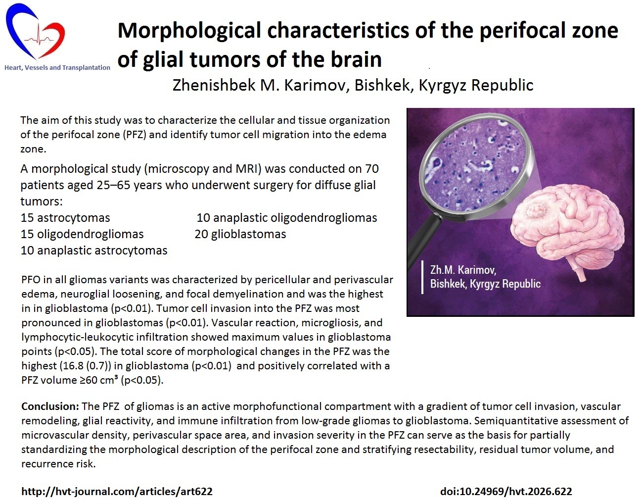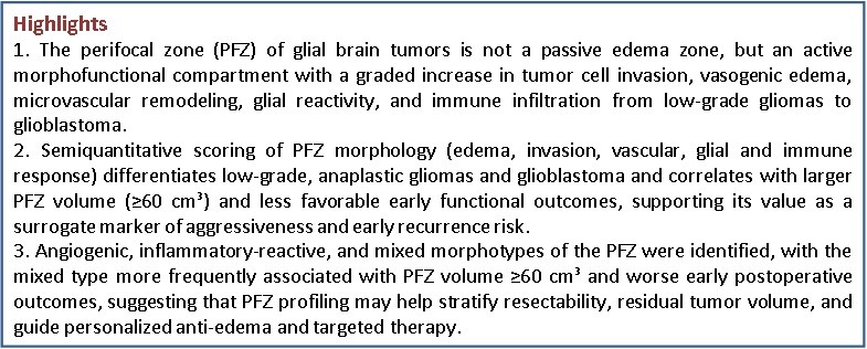 Conclusion: The perifocal zone (PFZ) of gliomas is an active morphofunctional compartment with a gradient of tumor cell invasion, vascular remodeling, glial reactivity, and immune infiltration from low-grade gliomas to glioblastoma. Semiquantitative assessment of microvascular density, perivascular space area, and invasion severity in the PFZ can serve as the basis for partially standardizing the morphological description of the perifocal zone and stratifying resectability, residual tumor volume, and recurrence risk.