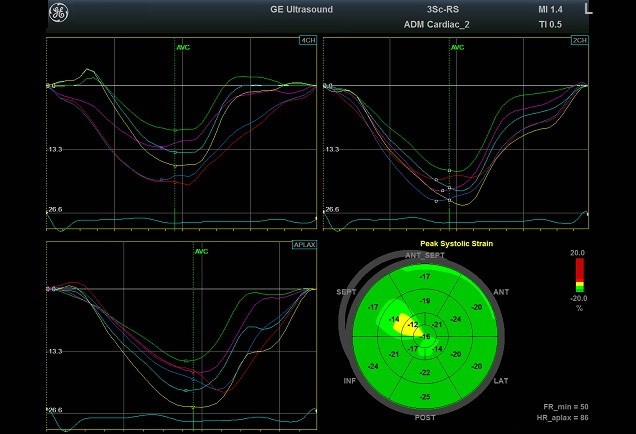 An echo study was conducted (Vivid T8, GE Medical Systems). Routine echo showed normal cardiac anatomy and function. Regarding the dimensions, they were within the normal values as indexed for the body mass index, while the function was normal as assessed with the biplane scanning, tissue Doppler as well as mitral and tricuspid annular plane systolic excursion. Speckle-tracking echo (STE) depicted preserved global strain of the left ventricle (-18.7%) with depressed peak systolic strain of septal apical (-12%) and mid-septal (-14%) segments (Fig. 2).