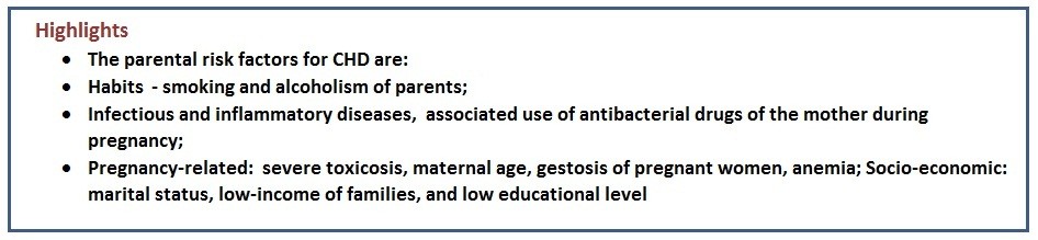 Conclusion: Thus, the most important risk factors for the development of CHD in children were smoking and alcoholism of parents, infectious and inflammatory diseases of the mother during pregnancy, as well as the associated use of antibacterial drugs; pregnancy-related factors as severe toxicosis, maternal age, gestosis of pregnant women, anemia; and socio-economic factors as marital status, low-income families, low educational level of the mothers of patients. The influence of these factors on the risk of CHD is indirect and largely depends on the quality of medical supervision of patients from socially disadvantaged families during pregnancy, since, as the study shows, such patients are registered late and follow medical recommendations less often.