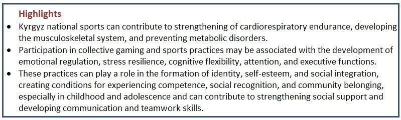 Conclusions: Kyrgyz national physical culture and sport are not only an element of cultural heritage but also a scientifically based tool for disease prevention and public health promotion, promising for integration into educational and health programs.