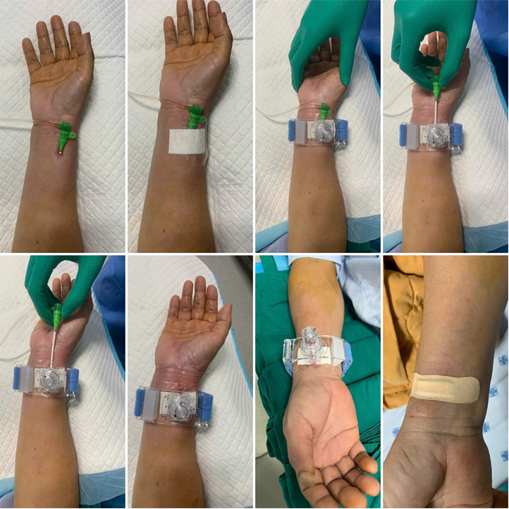 In the manual compression group (gauze), a sterile 2 × 2 cm gauze pad was placed at the puncture site, followed by localized compression using elastic adhesive tape applied according to standard technique. The initial degree of compression was adjusted to achieve hemostasis while maintaining adequate hand perfusion according to the principle of patent hemostasis. In both groups, hand circulation was assessed using pulse oximetry plethysmography during compression. In addition, a modified Allen test was routinely performed before the procedure to confirm adequate collateral circulation of the hand. Throughout compression, ulnar artery perfusion was ensured to minimize ischemic risk. The compression dressing was removed at 6 hours if no bleeding, hematoma, or other access-site complications were observed (Fig. 2).