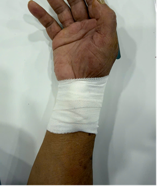Figure 2. Conventional manual compression using gauze and elastic adhesive bandage after transradial coronary intervention