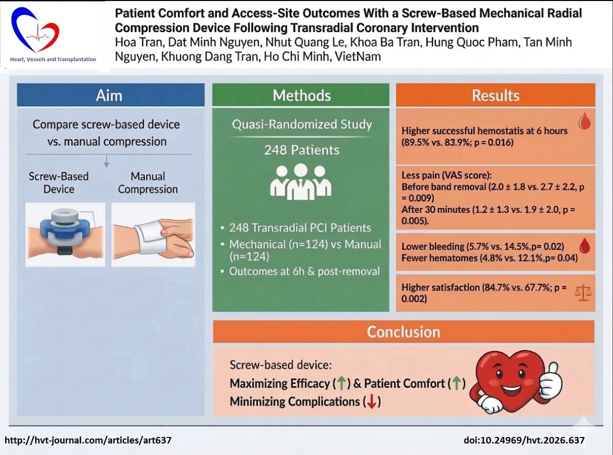 This prospective, controlled, quasi-randomized clinical trial was conducted at the Endovascular Intervention Unit, in University Medical Center Ho Chi Minh City, between August 2025 and December 2025. The study enrolled consecutive patients undergoing transradial coronary intervention (coronary angiography and PCI) via the radial artery. Eligible participants were adults (≥18 years) undergoing a transradial coronary procedure. Exclusion criteria included failed TRA; skin lesions, scars, or a history of wrist fracture at the access site; previously diagnosed arteriovenous fistula in the arm; technical difficulties preventing completion of the procedure according to protocol; and inability to communicate and/or to cooperate adequately during the procedure.