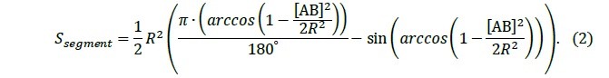 We need to find the area of the excised part in this plane of section – the shaded circular segment. From the scan data, we know the lengths of segments [OA], [OB], [AB]. Above we gave formula (1) for finding the area of such a segment.