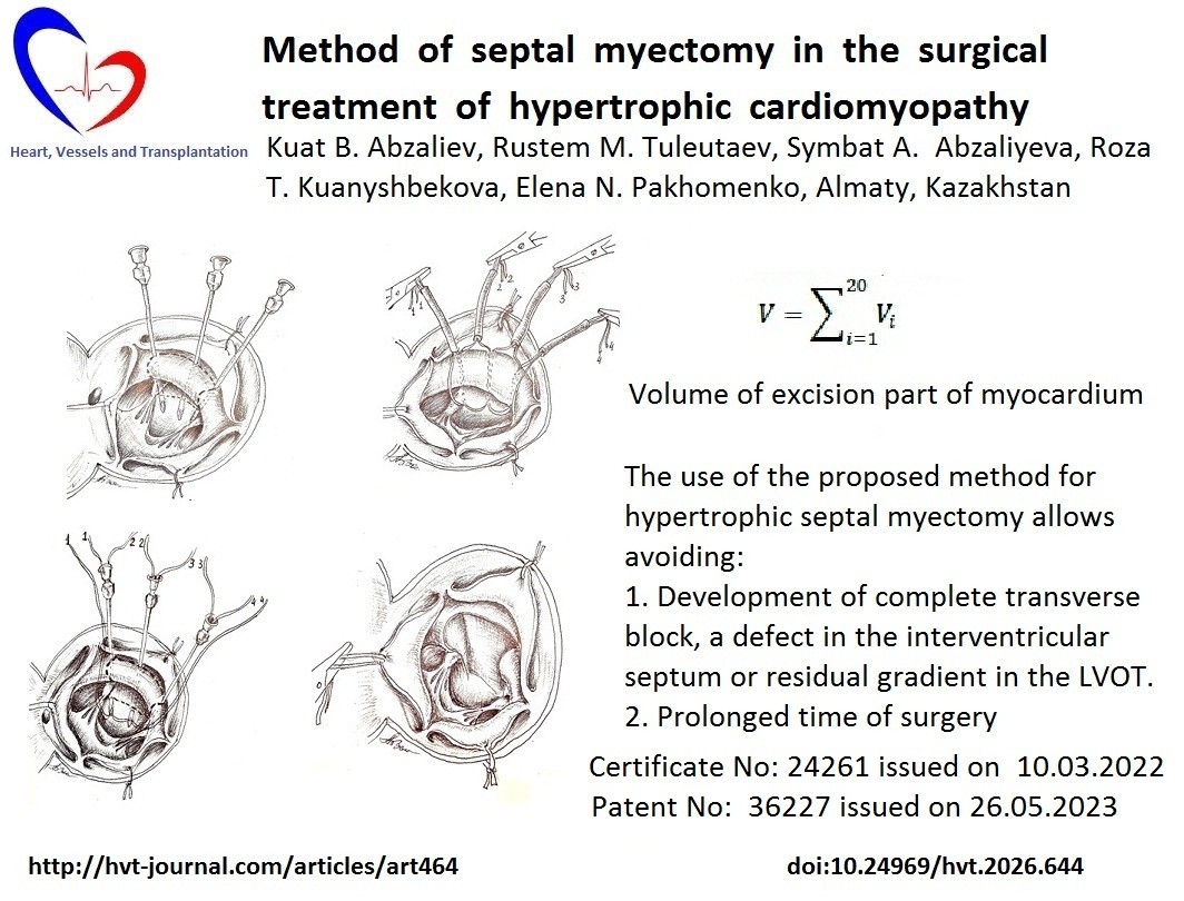 The closest method is the method proposed by Akihiko Usui with coauthors in 2013 (1). He proposed a method of surgical treatment of HOCM, which consists in after opening the ascending aorta inserting three needles into the area of the hypertrophied tissue. One needle is inserted under the middle part of the right coronary leaflet. The second needle is inserted under the commissure between the right and left coronary leaflets of the aortic valve. The third needle is placed between the two previous ones. The needles are withdrawn into the left ventricular cavity, stepping back 2-3 mm from the fibrous ring of the aortic valve, and then the needles are stabilized with Kocher clamps. Resection of the hypertrophied tissue is performed in one block along the three needles from the aortic valve ring toward the apex of the left ventricle. Known septal myectomy methods have shown their effectiveness but require careful and gradual resection of the hypertrophied portion of the interventricular septum (IVST) using a scalpel, which can lead to the development of a complete transverse block, creation of a septal defect, or inadequate myocardial resection and development of residual gradient at the LVOT.