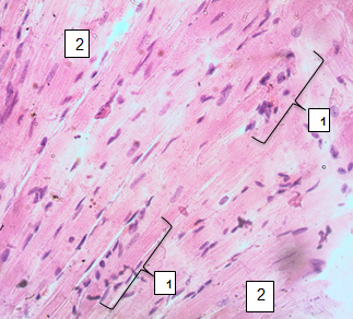 Figure 1. Rat myocardium on the 3rd day after traumatic brain injury, stained with hemotoxylin-eosin, ×400. 1 – compressed, hyperchromic nucleus (pyknosis) with elements of fragmentation (karyorexis) 2 – areas of necrotic cells |