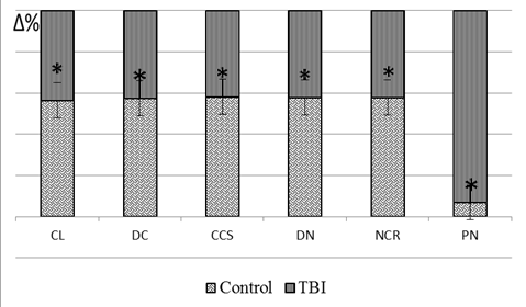 Figure 3. Morphometric analysis of the main characteristics of cardiomyocytes in animals that have suffered traumatic brain injury (%) CL - cardiomyocyte length, DC - diameter of a cardiomyocyte, CCS - cardiomyocyte cross-sectional area, DN - diameter of the cardiomyocyte nucleus, NCR - nuclear-cytoplasmic relationship, PN - pycnotic nucleus, TBI – traumatic brain injury * — significant differences from the control group (p < 0.05) |