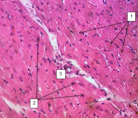 Figure 4. Rat myocardium on the 3rd day after TBI, receiving progesterone correction, hematoxylin-eosin staining, ×400 1 – cardiomyocytes with moderately oxyphilic cytoplasm, clear contours; 2 – nuclei of cardiomyocytes with clearly distinguishable nucleoli; 3 – the artery of the heart TBI – traumatic brain injury
