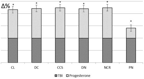 Figure 5. Morphometric analysis of the main characteristics of cardiomyocytes of animals with TBI on the background of progesterone correction (%) CL - cardiomyocyte length, DC - diameter of a cardiomyocyte, CCS - cardiomyocyte cross-sectional area, DN - diameter of the cardiomyocyte nucleus, NCR - nuclear-cytoplasmic relationship, PN - pycnotic nucleus, TBI – traumatic brain injury * — significant differences from the control group (p < 0.05) |