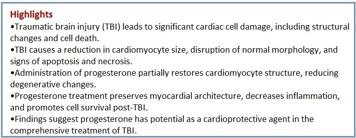 3. Progesterone helps preserve the structural integrity of cardiomyocytes, reduces the severity of dystrophic and apoptotic processes in the myocardium, and helps stabilize the morphofunctional state of the myocardium, which indicates its cardioprotective potential in systemic pathology caused by TBI.