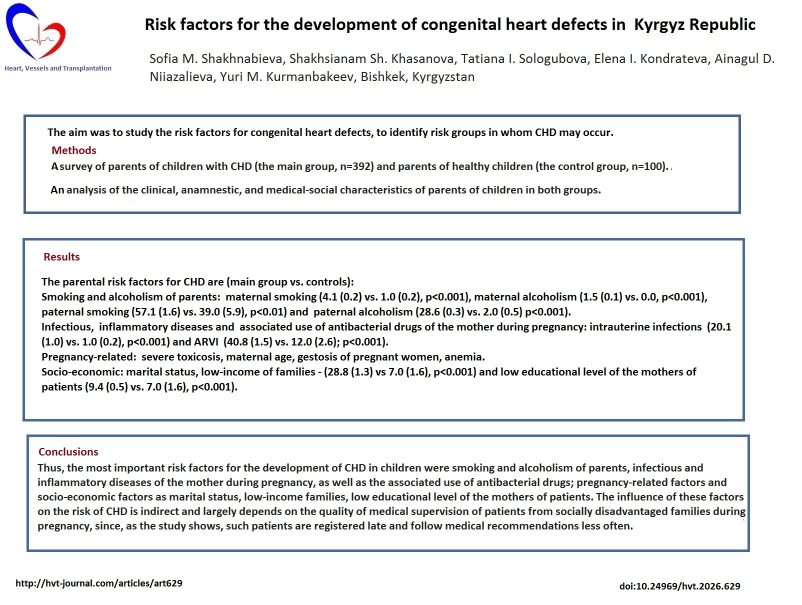 Conclusion: Thus, the most important risk factors for the development of CHD in children were smoking and alcoholism of parents, infectious and inflammatory diseases of the mother during pregnancy, as well as the associated use of antibacterial drugs; pregnancy-related factors as severe toxicosis, maternal age, gestosis of pregnant women, anemia; and socio-economic factors as marital status, low-income families, low educational level of the mothers of patients. The influence of these factors on the risk of CHD is indirect and largely depends on the quality of medical supervision of patients from socially disadvantaged families during pregnancy, since, as the study shows, such patients are registered late and follow medical recommendations less often.