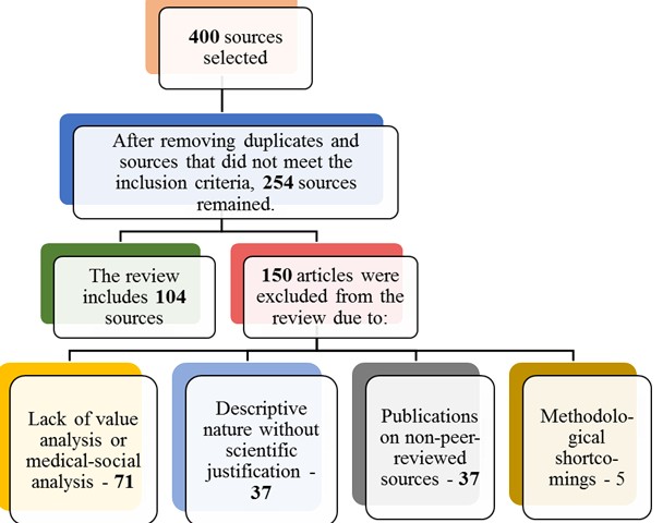Over 400 publications were initially identified, of which 254 were selected for analysis after removing duplicates and irrelevant sources. In the next step, 150 publications were examined in their full texts and excluded for the following reasons: lack of analysis of the value or medical-social component (n = 71), descriptive nature without scientific justification (n = 37), publications in non-peer-reviewed sources (n = 37) and methodological shortcomings (n = 5). In the final stage, 104 sources were included in the review, including peer-reviewed articles, books, monographs, and official international documents.