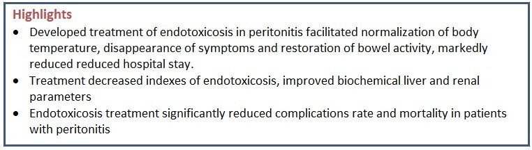Our study demonstrated that developed treatment of endotoxicosis in peritonitis facilitated normalization of body temperature, disappearance of symptoms and restoration of bowel activity, markedly reduced reduced hospital stay. It decreased indexes of endotoxicosis, improved biochemical liver and renal parameters, and significantly reduced complications rate and mortality in patients with peritonitis.