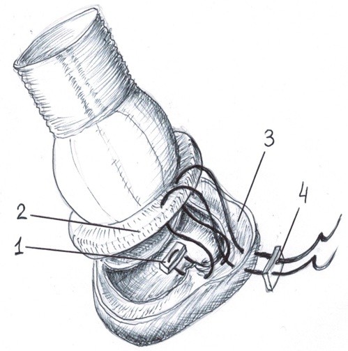 Description of the methodology: after excision of the aortic valve and the aorta, the proximal part of the ascending aorta is left 5-10 mm above the fibrous ring. After placing 12-15 individual 'Π -shaped' sutures performed under the fibrous ring of the aortic valve supraannularly (1), the conduit`s cuff is sutured (2) with the subsequent bringing out of thread ends to the remaining part of the proximal aorta (3) and if necessary plug-type entry points are used (4) on the threads and fixation.