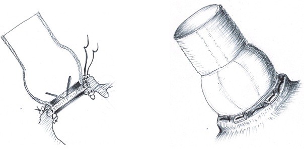 Figure 2. Diagram of aortic conduit implantation of the 'Sandwich' type (left) and the final view after