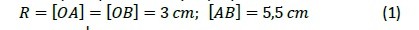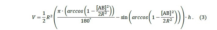 We need to find the area of the excised part in this plane of section – the shaded circular segment. From the scan data, we know the lengths of segments [OA], [OB], [AB]. Above we gave formula (1) for finding the area of such a segment.