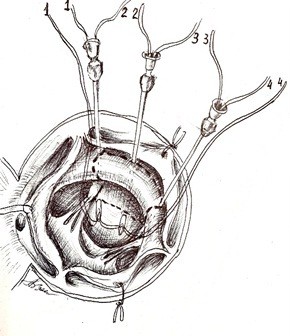 Description of the method: After inserting three needles into the projection of the IVST part to be excised (Fig.1), into the lumen of the middle needle (Fig. 2) insert the ends of two 3/0 Prolene threads and bring them out through the lumen of the needles at the edge, where another thread is fed, the needles are removed, and the thread ends are taken on a tourniquet (Fig. 3) and pulled tightly, cutting through the myocardium thickness with the thread (Fig. 4).