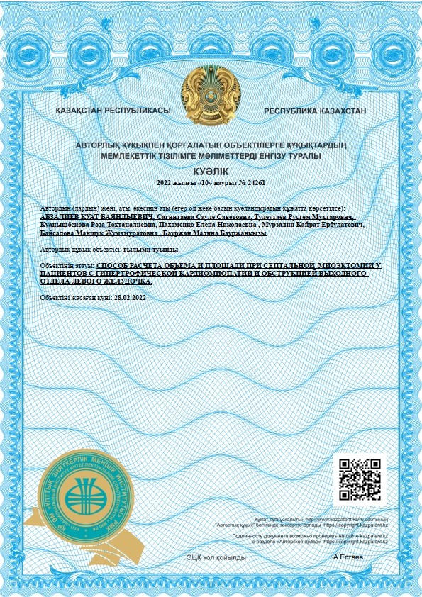 As the authors we have obtained a certificate of entry into the state register of rights to objects protected by copyright for “Method for calculating the volume and area of septal myectomy in patients with hypertrophic cardiomyopathy and outflow tract obstruction of the left ventricle” No. 24261 dated 10.03.2022 (Fig. 5).